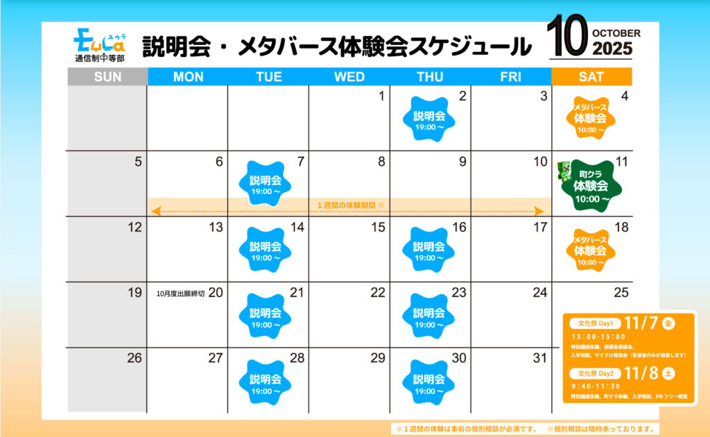 EuLa通信制中等部では、10月もオンライン説明会や体験会を開催します。